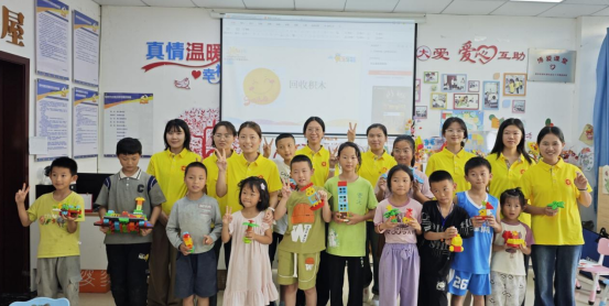 在理论知识讲解过程中志愿者还穿插进行了“纸槽传球”“纸杯叠叠乐”“蒙眼走直线”“漆扇制作”“情感乐高”等活动,与儿童进行开放式对话,增强体验感。