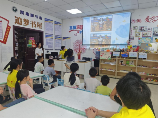 通过“影子识蔬果”小游戏引导孩子们辨识各类食物,讲解了主食、副食、蔬果、肉类在日常膳食中的作用及比例搭配,帮助儿童树立科学饮食观。与此同时,志愿者结合具体案例围绕校园欺凌的识别、防范与应对等进行了校园霸凌与反霸凌知识讲解,引导孩子们认识到“尊重他人、不做欺凌者,遇到霸凌及时求助”的重要性。