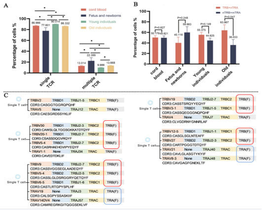 胸腺随着年龄增长而萎缩的过程中,影响着T细胞发育时的VDJ重排和自身耐受选择,导致婴幼儿/青年/老年人胸腺输出T细胞的数量和质量的差异。老年人群对病毒的易感性、对疫苗反应的低下,以及自身免疫病和肿瘤发生率的增高,同胸腺增龄性萎缩所导致T细胞应答能力的下降密切相关。本研究利用Single cell TCR(VDJ) sequencing 共享数据(不同年龄个体的胸腺、脐带血、外周血样本),发现青年人外周血中dual TCR 的alpha beta T细胞比例较老年人低,同时发现脐带血和胎儿/幼儿胸腺中亦有着较高比例的dual TCR 的T细胞比例。提示老年人和婴幼儿可能存在更高的TCR VDJ 等位排斥重组的逃逸和自身耐受选择的异常。本实验结果在以往研究老年人外周T细胞数量和亚群差异的基础上,提出了一种新的潜在的dual TCR T细胞异质性的研究方向。理论上,dual TCR T细胞可扩展外周TCR组库,但近年来发现其在自身免疫、T细胞肿瘤、器官移植排斥、外周T细胞寿命等病理情况下发挥重要作用,在探讨T细胞适应性应答的新机制研究中受到较多的关注。