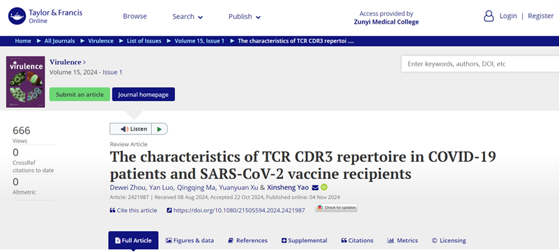 近日,公司姚新生教授团队在国际著名期刊《Virulence》(中科院1区/Top期刊)发表了题为“The characteristics of TCR CDR3 repertoire in COVID-19 patients and SARS-CoV-2 vaccine recipients”的综述。免疫学研究生2020级周得维,2022级罗彦,附属航天医院马庆庆为共同第一作者,姚新生教授为通信作者。